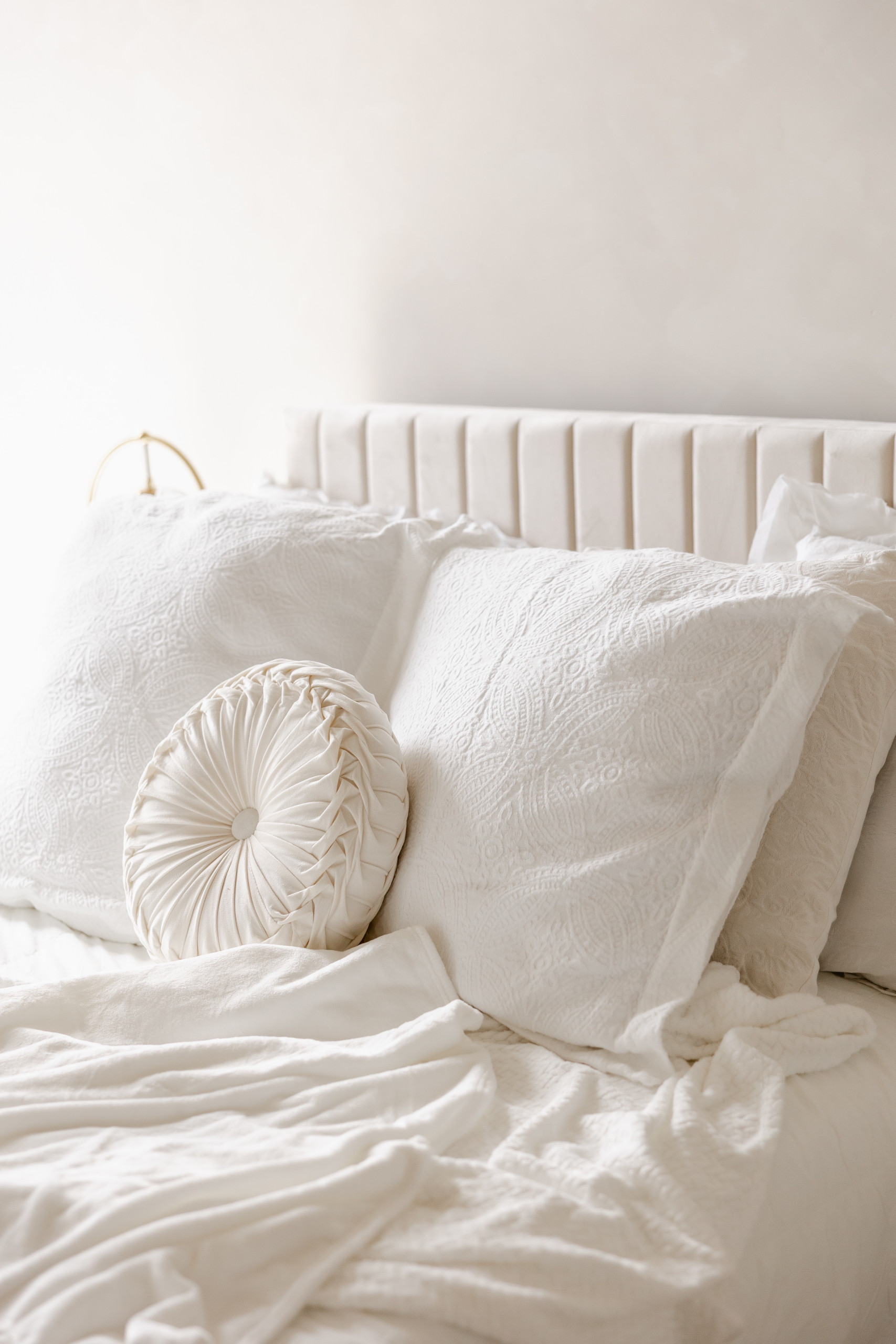 Dreamy white studio room with draped fabric canopy