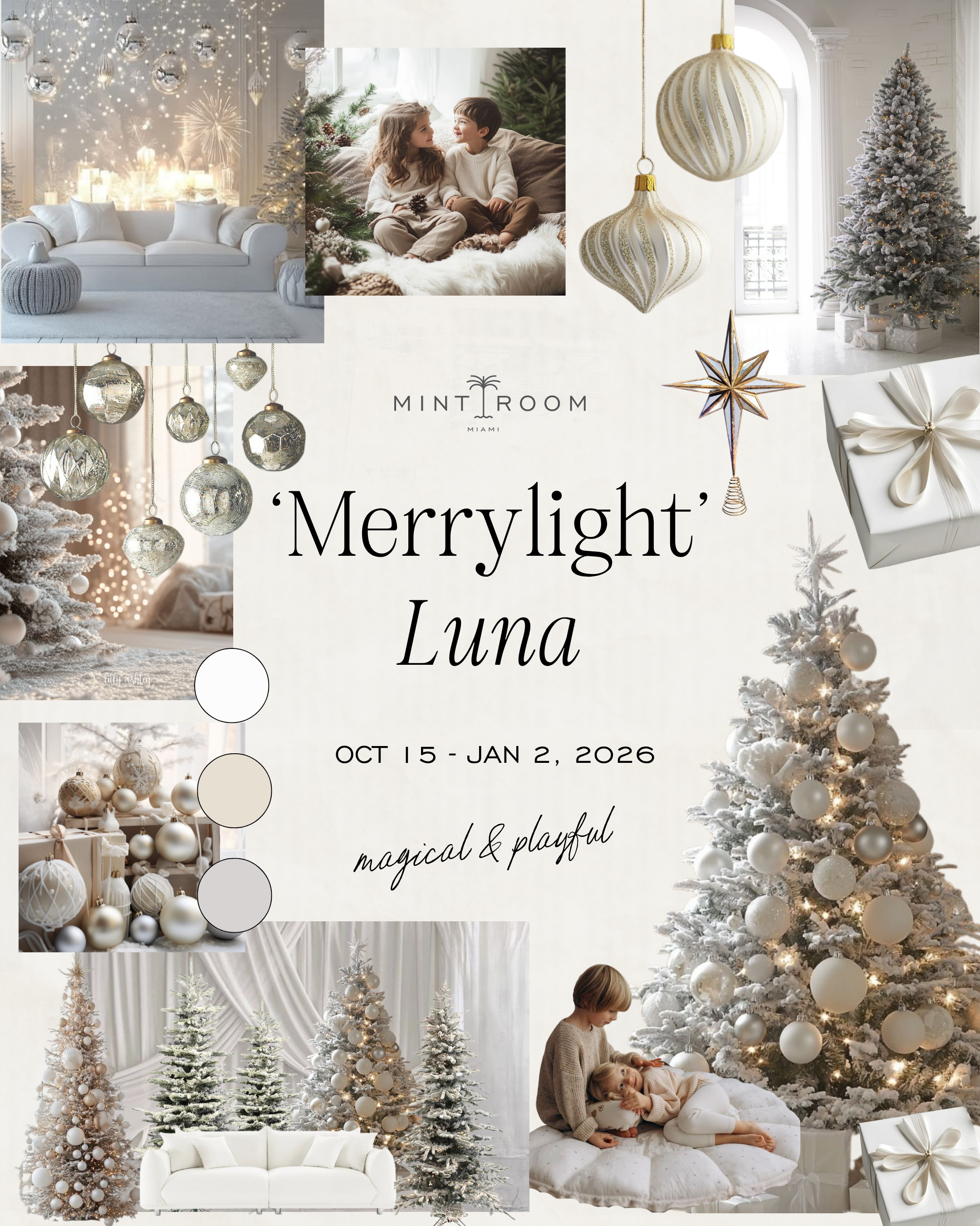 Merrylight in our Luna room will be a winter-inspired setup that captures the heart of the holidays with snow-dusted trees, timeless ornaments and soft neutral tones, all wrapped up in a warm, inviting glow.