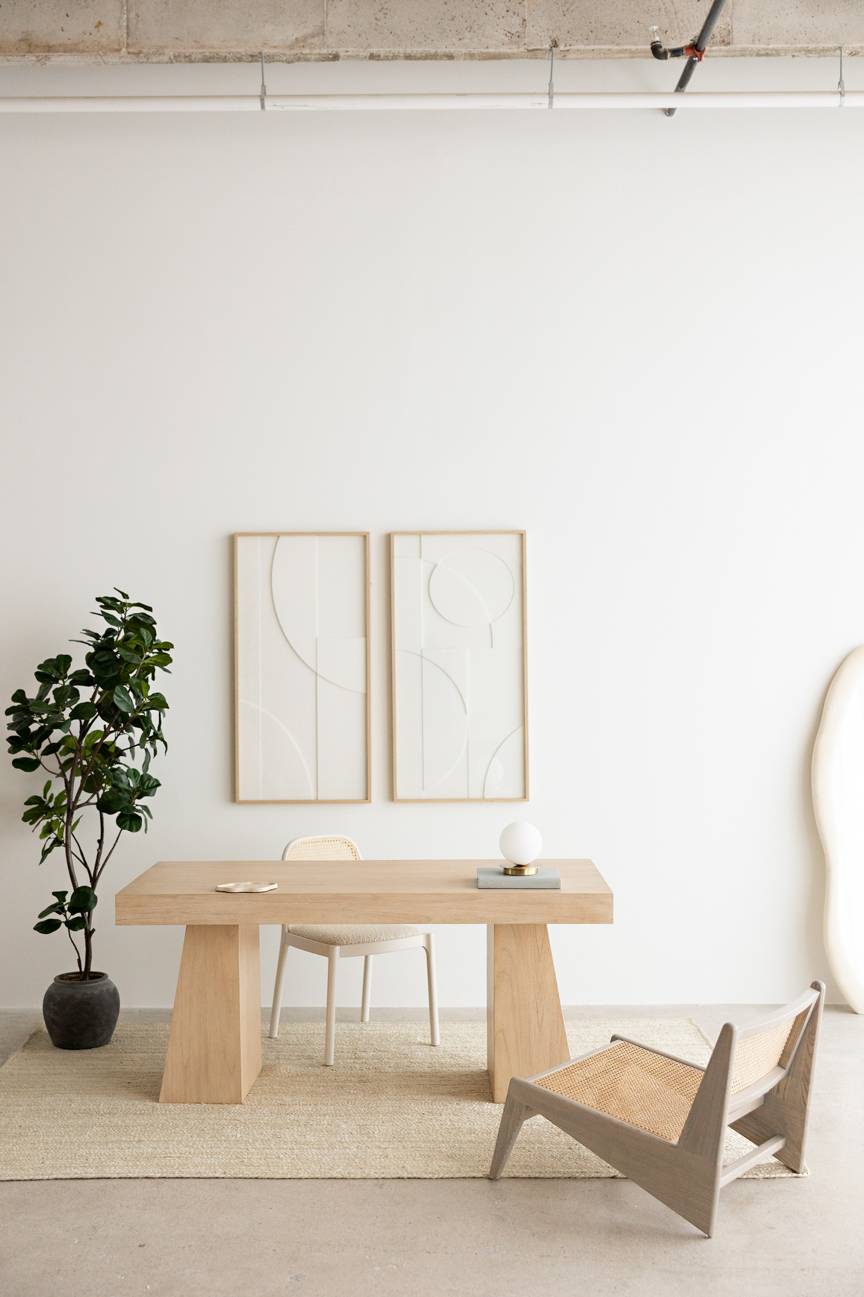 The decor features a modern curved sofa, woven chairs, and oversized terracotta vases, creating a harmonious and inviting atmosphere. On the opposite side, you’ll find a meticulously styled desk scene, adding an additional layer of versatility.
