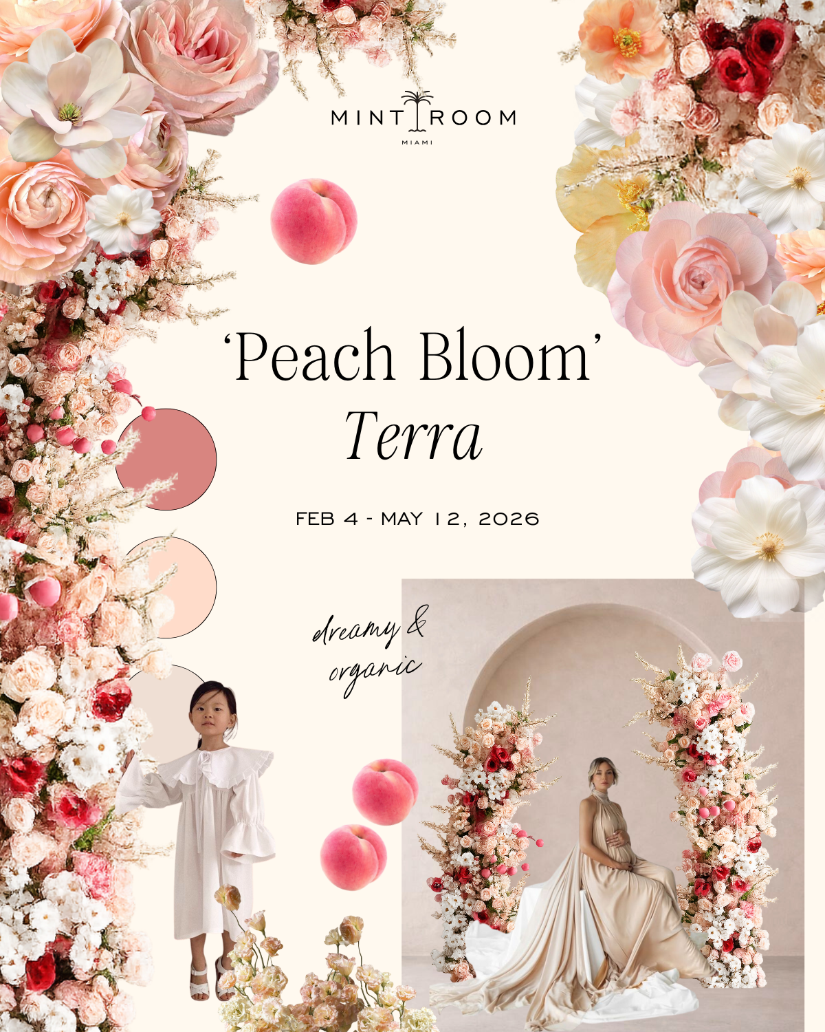 Terra’s signature arch is getting a fresh seasonal moment, framed by two mobile, oversized, asymmetrical floral structures that feel wild, airy and effortless. Think organic wildflowers in soft, sun-warmed tones- delicate pink + peachy hues that look like the first perfect day of spring (and yes, we’re leaning into the peach energy).
